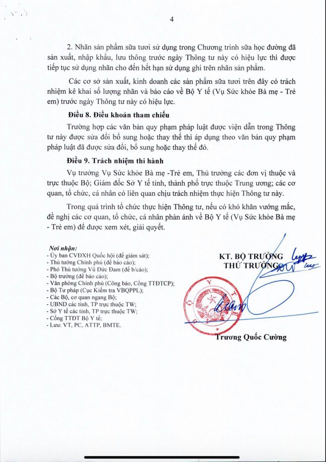 Các cơ sở sản xuất, kinh doanh các sản phẩm sữa tươi có trách nhiệm kê khai số lượng nhãn và báo cáo Bộ Y tế (Vụ Sức khỏe Bà mẹ – Trẻ em) trước ngày Thông tư có hiệu lực.