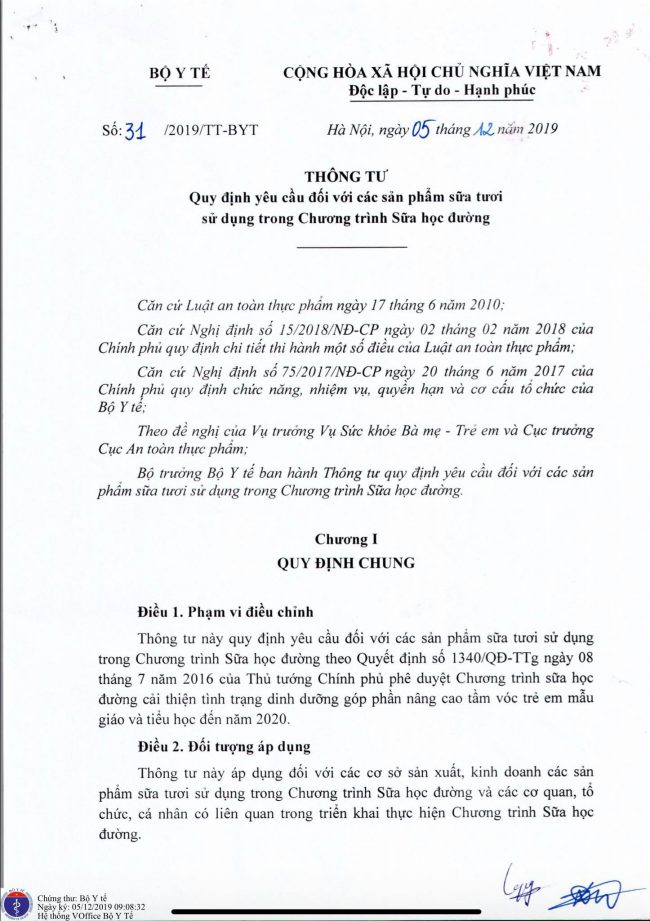 Thông tư này quy định đối với yêu cầu đối với các sản phẩm sữa tươi sử dụng trong Chương trình Sữa học đường theo Quyết định số 1340/QĐ-TTg ngày 8/7/2016 của Thủ tướng Chính phủ phê duyệt Chương trình Sữa học đường cải thiện tình trạng dinh dưỡng góp phần nâng cao tầm vóc trẻ em mẫu giáo và tiểu học đến năm 2020.