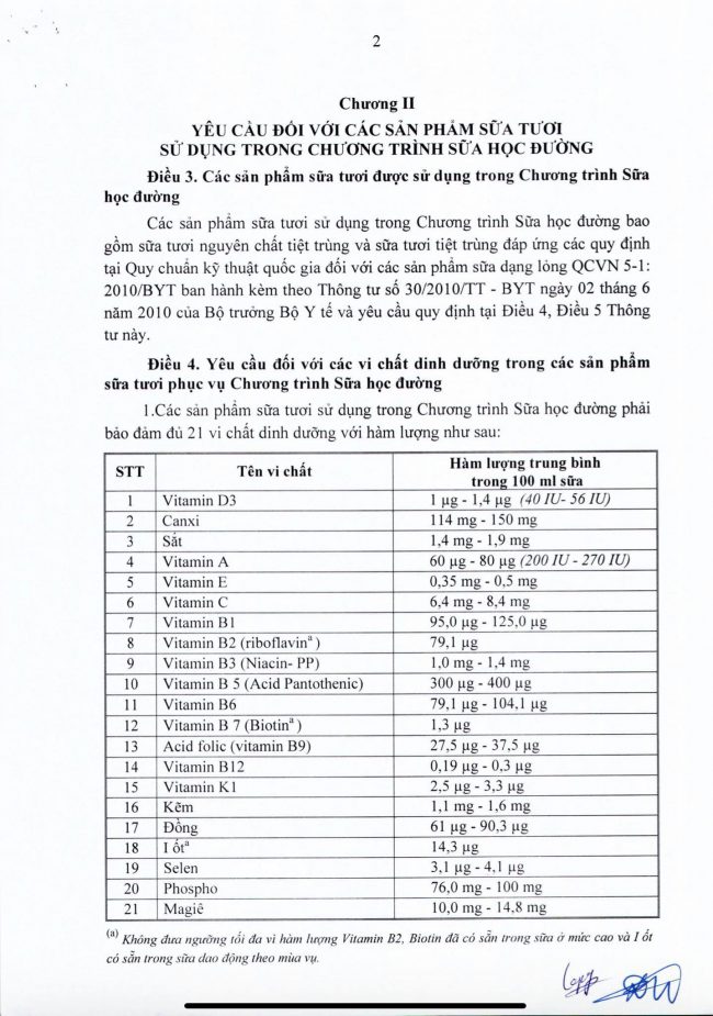 Yêu cầu đối với các vi chất dinh dưỡng trong các sản phẩm sữa tươi phục vụ Chương trình Sữa học đường phải bảo đảm đủ 21 vi chất dinh dưỡng với hàm lượng được quy định cụ thể (như bảng dưới đây).