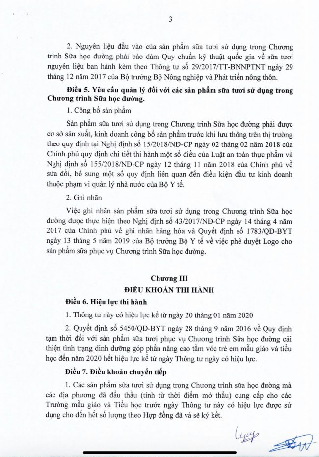 Thông tư nói rõ “Các sản phẩm sữa tươi sử dụng trong Chương trình Sữa học đường bao gồm sữa tươi nguyên chất tiệt trùng và sữa tươi tiệt trùng đáp ứng các quy định tại Quy chuẩn kỹ thuật quốc gia đối với các sản phẩm sữa dạng lỏng QCVN 5-1:2010/BYT ban hành kèm theo Thông tư số 30/2010/TT-BYT ngày 2/6/2010 của Bộ trưởng Bộ Y tế và yêu cầu quy định tại Điều 4, Điều 5 của Thông tư”.