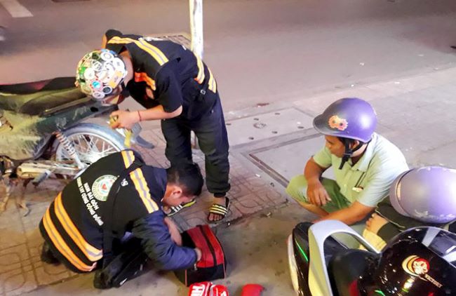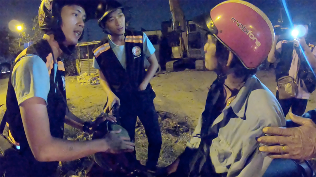 Cả đội tiếp tục di chuyển và phát hiện một nữ CN dắt bộ chiếc xe máy cũ, mồ hôi đẫm lưng áo đi ra từ KCN Hiệp Phước. Thấy 2 thành viên trong đội đến gần, lo sợ bị trấn lột nên nữ CN tỏ ra sợ hãi và la lớn: “Cướp… cướp”. Thế nhưng, sau khi được trấn an đây là những thành viên Đội SOS Nam Sài Gòn chuyên vá xe miễn phí, nữ CN mới lấy lại bình tĩnh. Và chỉ mất 12 phút, đội đã vá xong xe cho nữ CN này.