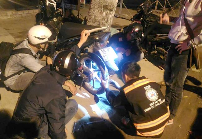 22 giờ, 8 thành viên của đội tập trung gần chợ Tân Mỹ (quận 7) để kiểm tra lại lần cuối dụng cụ sửa xe, cứu thương trước khi xuất phát. Hôm nay, đội có thêm một thành viên mới, đó là Lê Nguyễn Thuận Hưng (18 tuổi, ngụ huyện Nhà Bè). Hưng bị khiếm thính, việc trao đổi thông tin phải viết ra giấy. “Nhà em gần cầu Rạch Đĩa. Nhiều lần chứng kiến CN hì hục đẩy xe và được đội tìm đến vá miễn phí, em thấy thích nên xin tham gia” – Hưng cho biết.